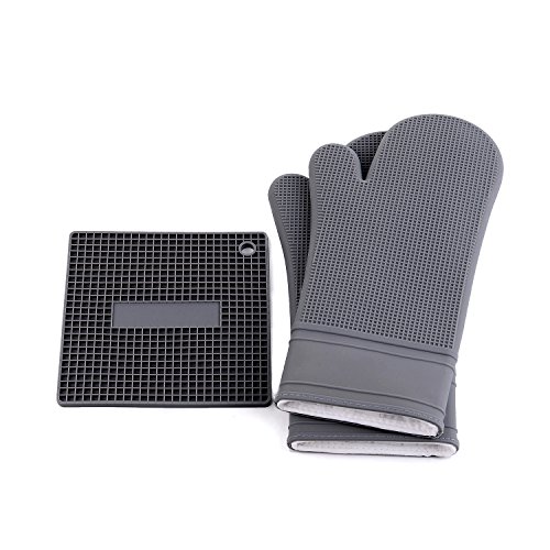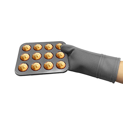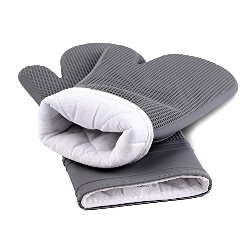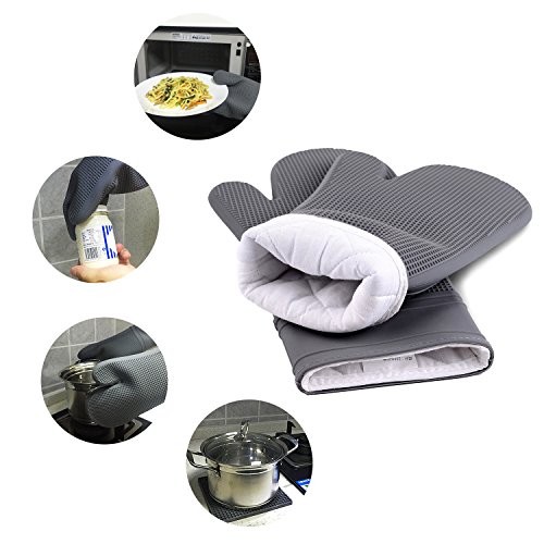 Gray Silicone Oven Mitts 1 Pairs Professional Extra Long Heat Resistant Kitchen Gloves with quilted cotton lining , Oven Mitt Set of 2