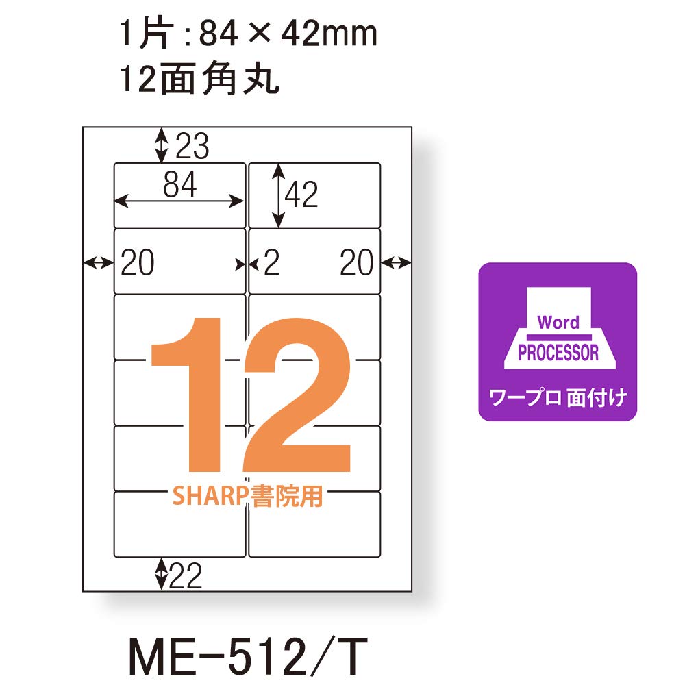 FSC認証紙を採用。「適切に管理された森林」に由来する製品であると保証された「環境配慮型の商品」。 宛名・住所・商品・ロゴ・タイトル・収納内容・値札表示などに 規格:A4 角丸12面四方余白 一片:83.8×42.3mm SHARP書院シリーズ用 数量:100シート入(12×100=1200片入) 紙厚:総厚:124µm(0.124mm)、ラベル厚:71µm(0.071mm)、ラベル坪量:70g/㎡