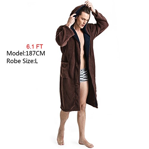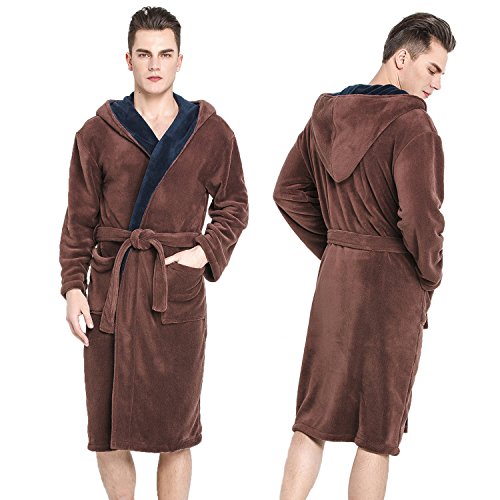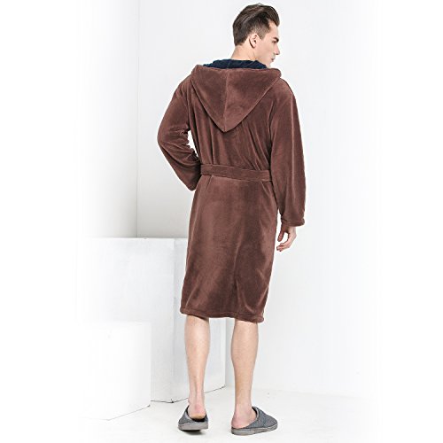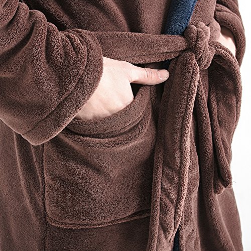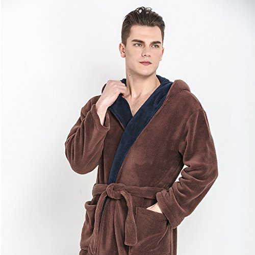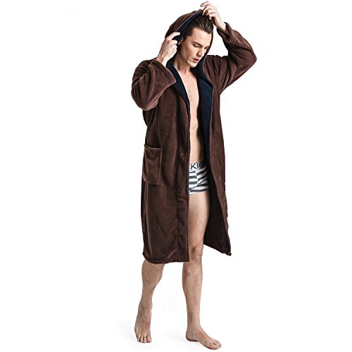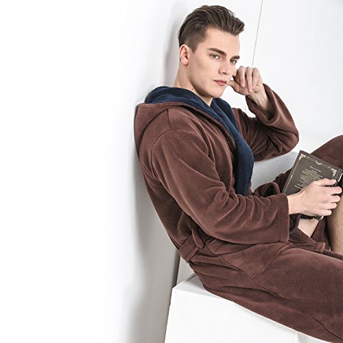 Hooded Herringbone Men's Brown Soft Spa Bathrobe with Navy Blue Kimono Shawl Collar