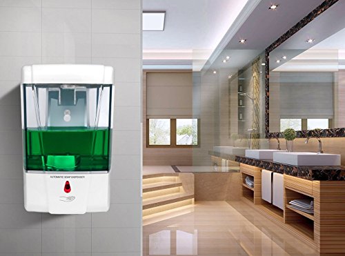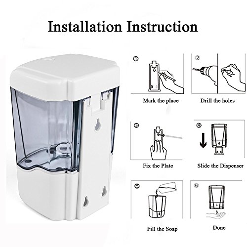 Features:? Updated anti-leakage technology to prevent soap waste, help save your money? Easy to install and safe to use, the mount for the back of the dispenser sticks right to the wall, very sturdy? Bigger capacity and longer lifespan, up to 20,000 working times? With LED indicator light, more convenient to use at night? Specifications:? Plastic material: ABS, AS? Capacity: 700ML? Liquid dosage: 0.8-1ml? Unit weight: 500g? Rated volt: DC 6V? Static current: 60uA? Work current: 120mA? Battery type: 4pcs 1.5V AA alkaline (not included)? Sensor range: 0~8cm? Low battery indication: ≤4.2V? Dimension: 11*9.5*16.5cm / 4.3*3.5*6.5 inches? Installations:? 1. Choose a suitable position to mount the dispenser on the wall, sensor system is at the bottom of the dispenser; Please keep 20cm free space at least under the sensor system? 2. Slide the fix plate out of the dispenser, use this plate as a template to mark three drill spots? 3. Drill two 5mm holes, and then insert the plastic plugs? 4. Fix the plate on the wall with two screws then slide the dispenser in the plate? 5. Insert 4pcs"AA" batteries(not included) into the battery compartment according to the diagram indication? 6. Open the container lid? 7. Fill in liquid? 8. Turn on switch? Package Include:? 1* Wall-Mounted Soap Dispenser? Tips:? At the first use, since the liquid has not completely flows through the pipe, it may not dispense liquid at first, please try several times. Or feel free to contact our seller Customer Service 0 |
