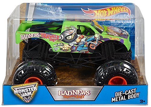 -. Binding : Toy -. Brand : Hot Wheels -. EAN : 0887961232097 -. Feature : With even more accurate designs, this 1:24 scale truck is made with durable die-cast metal parts / Its monster wheels are ready for mega tough terrains, too! / Decorated just like its high-flying, car-crushing, oversized inspiration / Pick up the other vehicles in the assortment and head to the Monster Jam arena for head-to-head battle! / Collect them all -. IsAdultProduct : 0 -. Label : Mattel -. Manufacturer : Mattel -. Model : DJW97 -. MPN : DJW97 -. PackageQuantity : 1 -. PartNumber : DJW97 -. ProductGroup : Toy -. ProductTypeName : TOYS_AND_GAMES -. Publisher : Mattel -. ReleaseDate : 2016-04-13 -. Studio : Mattel -. Title : Hot Wheels Monster Jam Bad News Travels Fast Truck -. UPC : 887961232097 -. Warranty : 1 year warranty against manufacturer defects
