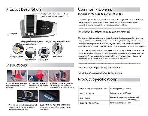 -. Binding : Electronics -. Brand : Y Love -. Feature : ✔ HIGH-DEFINITION LENSES - 6-ring high-definition lenses,and the convex lens group clearly will never light projection distortion / ✔ RECHARGEABLE - Advanced USB technology with built-in 600mAh battery,charge for 1 hour can be used for about 15 days. / ✔ EASY AND LOSSLESS TO INSTALLATION - Fixed by adhesive tape,suitable for almost any cars. / ✔ ESPECIALLY DESIGN - This product is especially designed for auto modification fancier and it will not destroy the original car appearance bring more driving fun to drivers. / ✔ INTELLIGENT SWITCH - The dazzle logo light and the signal light will display on the ground when you open the car door and it will be turn off when you close the door. -. Label : Y Love -. Manufacturer : Y Love -. MPN : BVBWL01 -. PackageQuantity : 1 -. PartNumber : BVBWL01 -. ProductGroup : Photography -. ProductTypeName : CAMERA_OTHER_ACCESSORIES -. Publisher : Y Love -. Studio : Y Love -. Title : Car Door LED Projector Light, Y Love Wireless Car Door Welcome Ghost Shadow Logo Light Black Set of 2