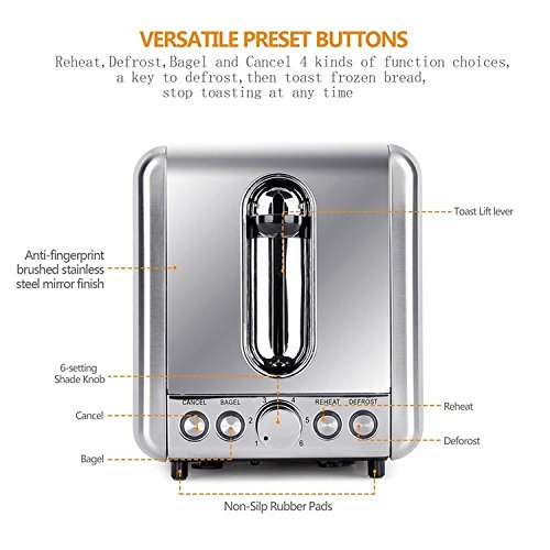 ?Why choose SVVSS's Toaster? This SVVSS toaster will be a great addition to your kitchen or office. Features a beautiful brushed stainless steel body, it will look great on your countertop. Equippes with extra wide slots for toast, frozen waffles, toaster pastries, and more. This toaster has quick buttons for Bagel,defrosting, reheating, and canceling. For custom control, it features a 1-6 toast shade control setting. Shade Control Setting: Shade control setting offers a full range of browning options to allow perfect customization of any piece of bread. Settings 1-2: light shade of toast Settings 3-4: medium shade of toast Settings 5-6: dark shade of toast Multiple Toasting Functions: This unit comes with the following toasting functions: Toast: for normal bread toasting Bagel: toasts just the cut side and heats the upper half of the bagel only for a crispy top and a soft.?