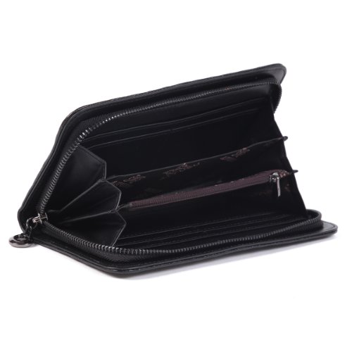 Organize cash and credit cards in style inside this soft vintage leather clutch wallet from DAMARA. This Clutch wallet features a slim shape and an elegant design.This wallet has a secure zipper around closure and a well organized interior that includes 6 card slots to hold credit cards, debit cards, and photo ID, a center zippered dividing compartment to hold loose change, 3 large pockets, and plenty of storage for cash, important papers, and receipts.