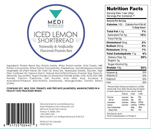 -. Binding : Health and Beauty -. Brand : Medi-Weightloss -. EAN : 0794168686342 -. Feature : Irresistibly Tart With a Subtle Sweetness / Only 100 Calories Per Serving / Each Bar Has 10g Protein to Help Keep You Fuller Longer / Only 10g Carbs Per Serving (7g Fiber) / Delicious And Convenient, These Bars Are The Perfect Take And Go Breakfast, Afternoon Pick-me-up, or After-Dinner Treat -. IsAdultProduct : 0 -. Label : Medi-Weightloss -. Manufacturer : Medi-Weightloss -. MPN : 8686342 -. PackageQuantity : 7 -. PartNumber : 8686342 -. ProductGroup : Health and Beauty -. ProductTypeName : HEALTH_PERSONAL_CARE -. Publisher : Medi-Weightloss -. Studio : Medi-Weightloss -. Title : Medi-Weightloss Iced Lemon Shortbread Protein Bars - High Protein (10g) - 100 Calories - For Hunger Control During Diet/Weight Loss - 7 Bars Per Box -. UPC : 857723004453