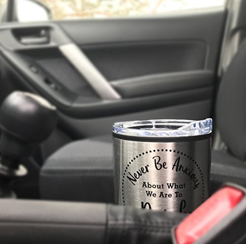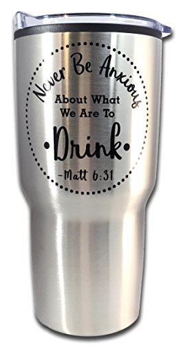 Scriptural Reminders On The Go! Large Stainless Steel Travel Mug. Sprinkle scriptural reminders from our Creator around your life! Stainless steel travel mug featuring Matthew 6:31 from the Holy Bible. We are reminded that are told to not be anxious in anything, even while drinking. Hand Wash Only.