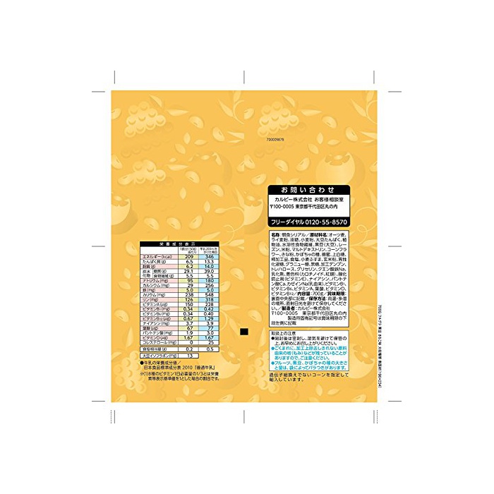 원재료:O《즈》맥,호밀분,액당,소맥분,대두 담백,식물성 기름,수용성 음식물 섬유,검은 콩(대두)고, 레이의《》,미분,말《도데키스토린》,콘 플라워,콩가루,호박의 종,당꿀,상백설탕,시가공품,식염,밀 # 해결되고, 현미분,이성화 액당,granu당,흑당,가공 전분,트레이닝 헬로《스》,글리세린,구연산철Na,유화 제,착색료(카로 치노 이 드,홍누룩)고, 산화 방지제(비타민E)고, 나이아신,판토텐산Ca,(Kasein)카세인Na(유유래)고, 비타민B1,비타민B6,비타민A,엽산,비타민D,비타민B12