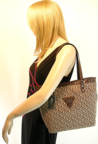 Canvas style in mocha brown with the G logo monogram print. Guess name plate on the exterior of the bag in silver. Patent accents and trim. Approximately 13 inches across by 11 inches high and a depth of 6 inches. Tab top snap closure. Fully lined. Interior cell phone pocket and 3 additional slip pockets. Straps drop approximately 9 inches, perfect for over the shoulder Metric Measurements: Approximately 33.02 cm x 26.67 cm Tag information: Name: Tansy Style No: ZZ288731 Color: Mocha