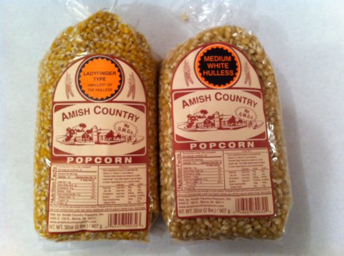 Amish Country Popcorn Variety 2 Bags 2 Lbs Each Total 4 Lbs Non Gmo, Ladyfinger Type, Medium White Hulless