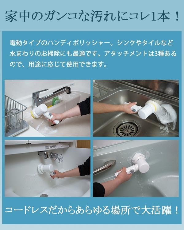 | シンクやタイルなどの水まわりのお掃除にもおすすめ!アタッチメントが3種類あるので、用途に応じて使用できます。 |