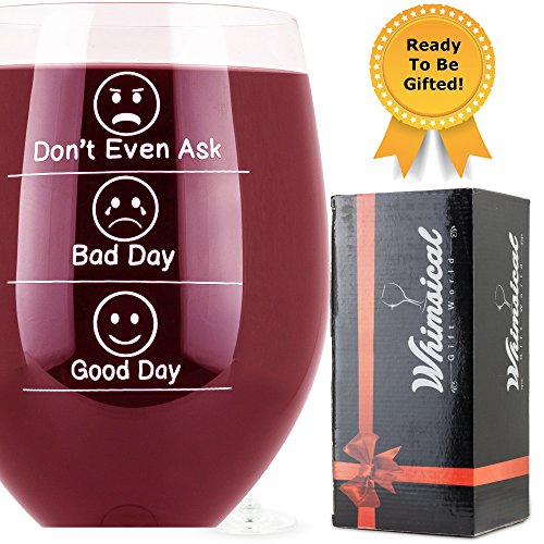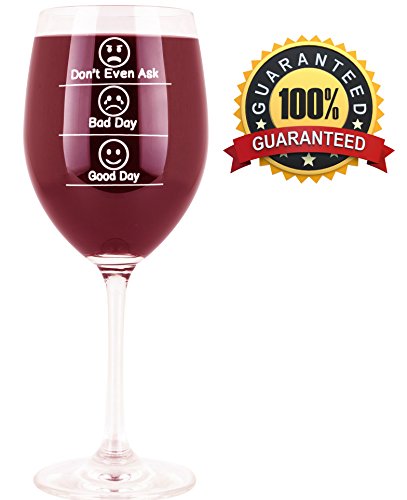 Enjoy Your Wine Have Fun With Whimsical Emoji Wine Glasses! Can't wait, to finish work, go home and enjoy a wonderful glass of wine? Fed up with cheaply made and easily broken glasses? Looking for the best gag gift for your friend? If you are nodding, then you should keep on reading. We have the most humorous emoji wine glasses for you! Uncork, Pour, Swirl, Lay Back Enjoy - Wine Tasting Has Never Been That Easy Fun Before! Feeling fancy today? Then, why not go for the best of the best when picking your wine glasses? Surprise your friends and family the next time you have them over with these funny glasses. The emoji faces and sayings (don't even ask, good day, bad day) are printed on both sides for greater drinking performances. Let them know how you feel about wine! Our cute wine glasses are not only great for red and white wine, but for juice, exotic cocktails, beverages, sparkle water, and other drinks as well! They are perfect for birthdays and theme parties, weddings, Christmas holidays, anniversaries, family celebrations, wine festivals, graduations, traveling, camping, beach excursions, picnics in the park, and relaxing moments alone! Here's Why This Emoji Wine Glass Is An Absolute Must Have: ? Premium quality, lead free crystal glass. ? Fun emoji faces and witty quotes printed on both sides. ? For women, men, adults, teachers, office, home, and parties. ? Large, tall, 14 Oz. wine glass. ? For Sangiovese, Merlot, Pinot Noir, Moscato, Chardonnay, Cabernet Sauvignon, Chenin Blanc, Riesling, Rose wine, and more. ? Carefully wrapped and placed in a gift box! Makes the greatest novelty gift!