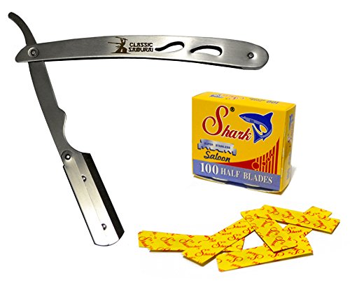 Classic Samurai CS-102 Stainless Steel Professional Barber Straight Edge Razor with 100 Count Shark Single Edge Razor Blades