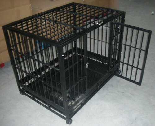 -. Feature : This is a heavy duty cage designed for pitbull and breeder, this cage constructed with the 3/4" frame, forged from 20-gauge steel, Heavy-duty welds & stout door latches and floor grate, removable tray & four removeable-locking wheels for added mobility. / There is a small door in the bottom of the big front door, so your dog can still use that door to drink the water or eat the food while staying inside the cage. / The top part can be open for easy access of the dog, this is considered the third door of the cage. / The crate is 42" Long, 32" High and 30" Wide. / Easy to install, take less than 2 minutes to install the whole cage.