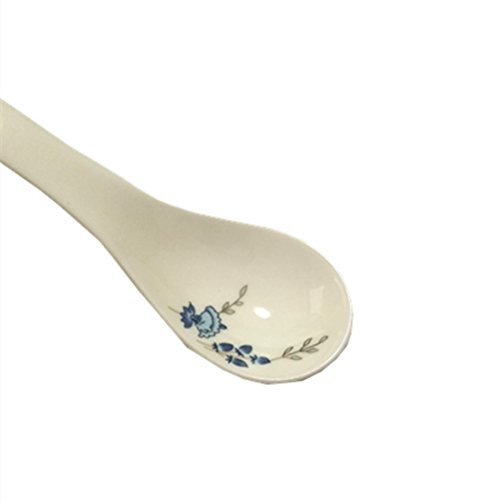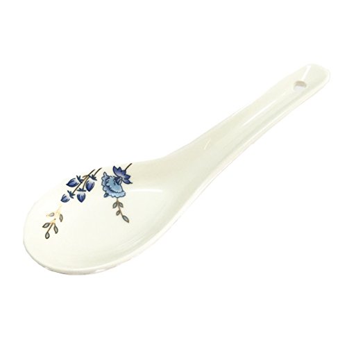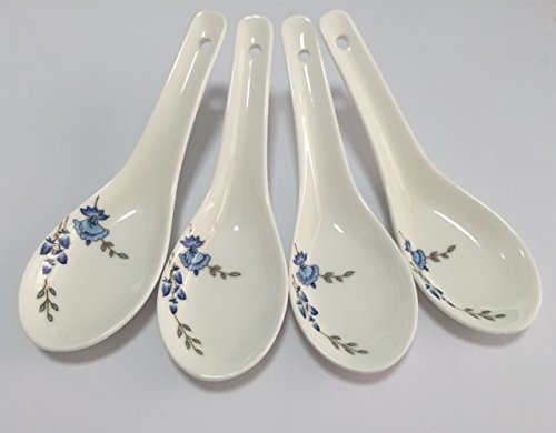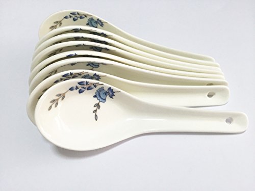 Derker Set of 8 White Porcelain Blue Flower Patterned Asian Soup Spoons 4.8" Long (Bud)