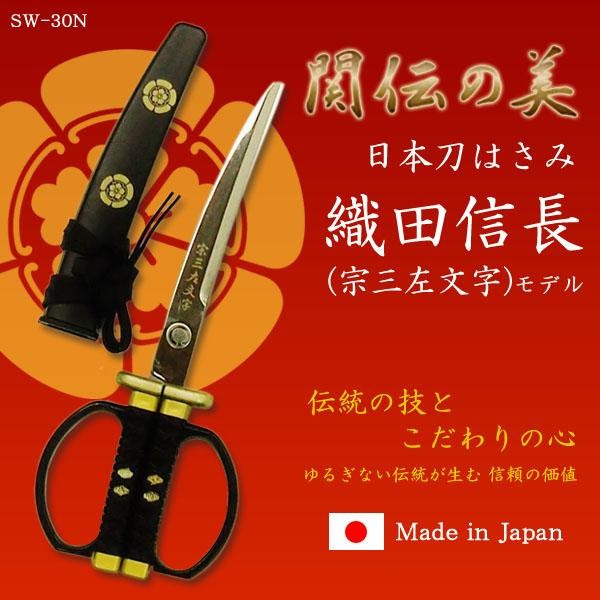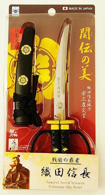 | 織田信長の愛刀・宗三左文字をモチーフとしたハサミで、刃体の反りと刃紋にこだわりをもった作りとなっております。鞘には織田家の家紋「五つ木瓜」がつき、刃体には愛刀の名称が入り、信長の威厳漂うデザインとなっております。刃物の町、岐阜県関市の職人が1本1本丁寧に刃付けをした切れ味抜群の商品です。 |