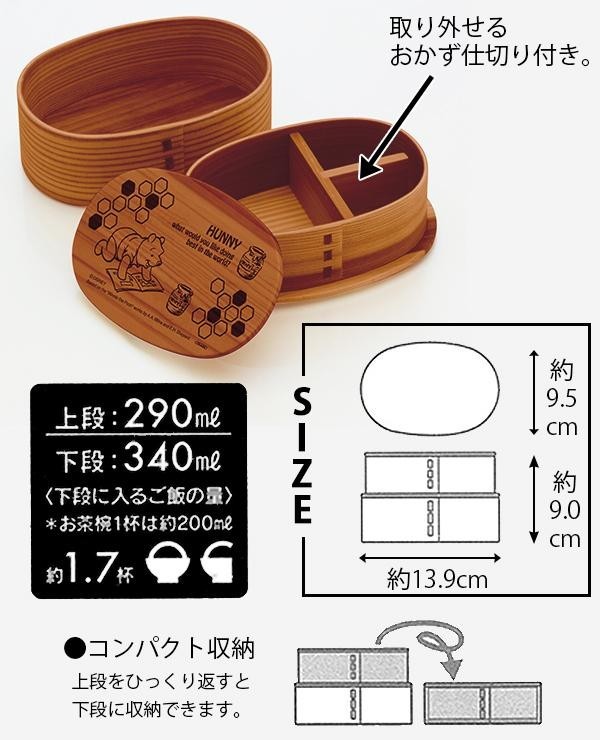 天然木ならではのやさしい風合い。軽量で持ち運びがしやすく、優れた通気性があります。夏はご飯が傷みにくく、冬は保温性が高まります。上段をひっくり返すと下段に収納できるので、コンパクトになります。 |