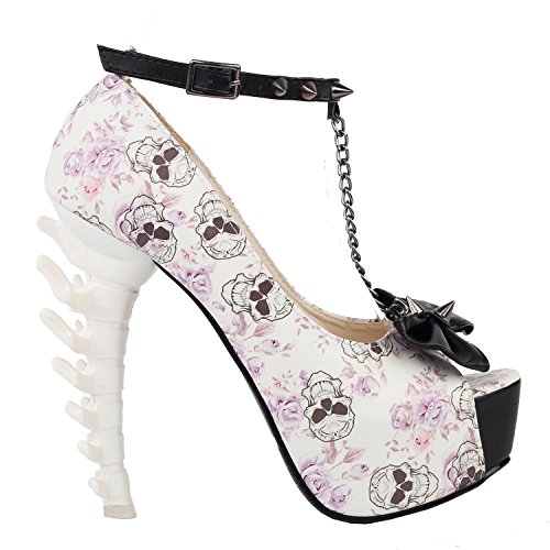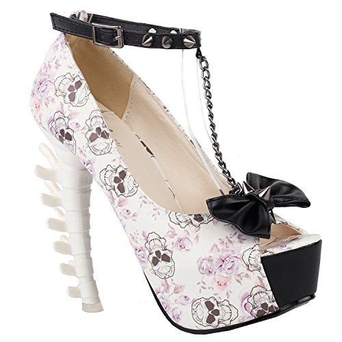 -. Binding : Apparel -. Brand : Show Story -. Department : womens -. Feature : Peep toe platforms / Personality dinosaur heels / Lightly padded insole / Please Use the Sizing Chart Image on the Left. / Sometimes, our estimated size is not the same as the labeled size due to large or small make of an item. -. Model : LF80631 -. ProductGroup : Shoes -. ProductTypeName : SHOES -. Title : Show Story Skull Rose Print Studs Chain Peeptoe Platform Bone Heel Pumps,LF80631