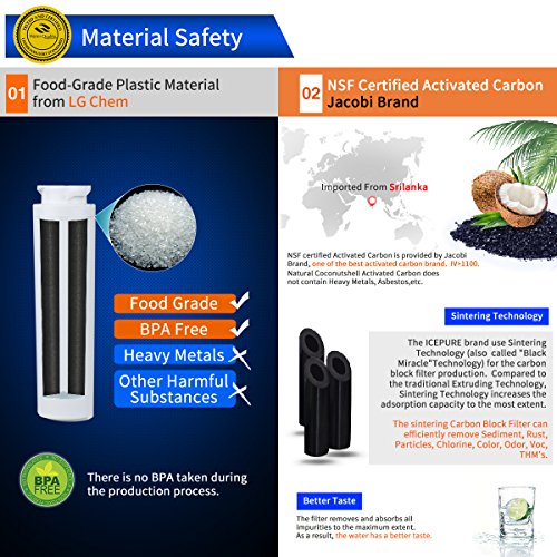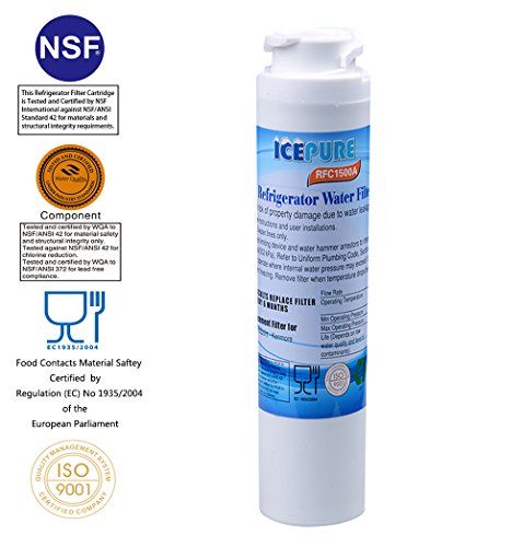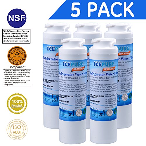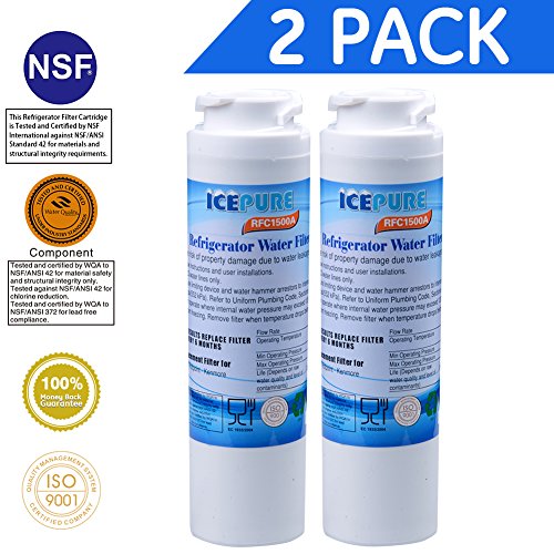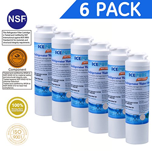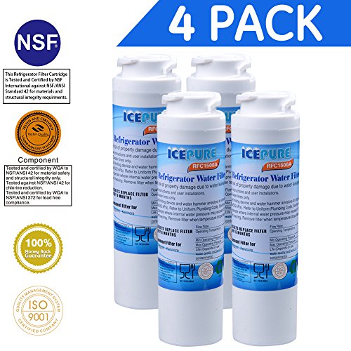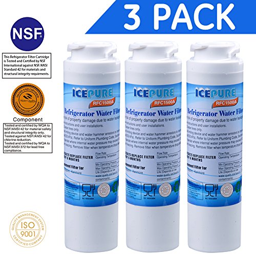 FREE UPGRADE TO PRIORITY MAIL SHIPPING! 3 - PACK SPECIAL SAVES YOU MONEY! IcePure RFC1500A Water Filter Replacement. Benefits of The Filter: The Activated Carbon Block Filter inside has NSF 42 APPROVAL. The Carbon Block is made with the latest and technologies and qualifications. The quality of the filter is the same as the branded filter. Removes chlorine, taste and odor Does not remove beneficial minerals. All filters are certified to be free from leaks if properly installed and to function with the latest modifications from the OEM. All components NSF-42 certified. Manufactured in an ISO9001 facility. Member of the Water Quality Association. In Business since 2001 and continually growing! Specifications: MATERIAL: NSF Coconut shell Activated Carbon MICRON RATE: 0.5 Micron OPERATING TEMP.: 34-100 F (1-38?) OPERATING PRESSURE: 30-120psi FLOW RATE: 0.5 GPM FILTRATION LIFE: 6 months/300G *Filter Life depends on water quality and level of contaminants. Removes the following contaminants: 99.30% of Lead at pH 6.5 99.90% of Lead at pH 8.5 94.50% of Mercury at pH 6.5 96.60% of Mercury at pH 8.5 99.92% of Asbestos 89.60% of Benzene 99.90% of P-Dichlorobenzene 99.99% of Cysts 98.70% of Carbofuran 97.00% of Chlorine 99.10% of Turbidity 97.60% of Particulates (Class I) Replaces the following: MSWF 101820A 101821-B 101821B 238C2334P003 AP3997949 MSWF3PK MSWFDS PC46783 PS1559689 RWF1062 WF-282 WF282 WR02X12345 WR02X12801 WSG-3Feature