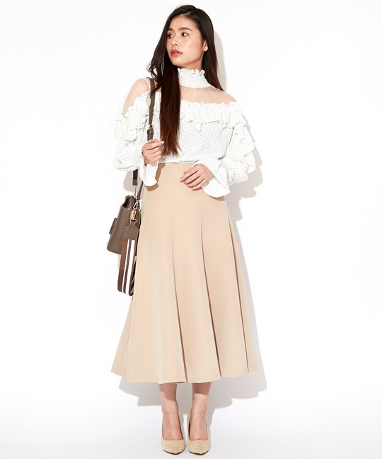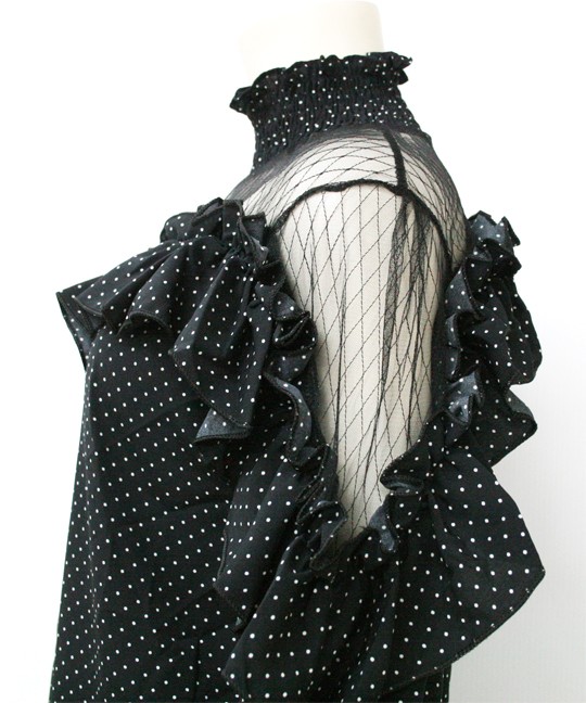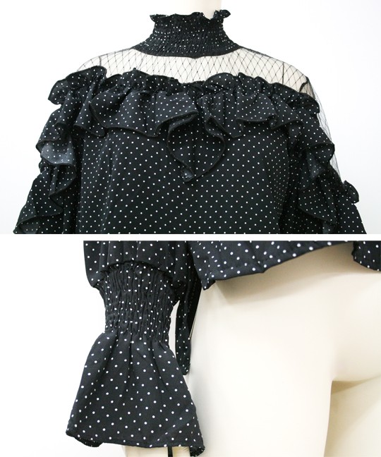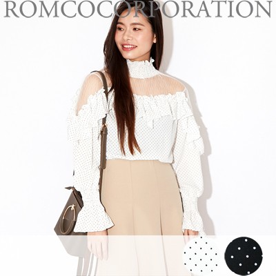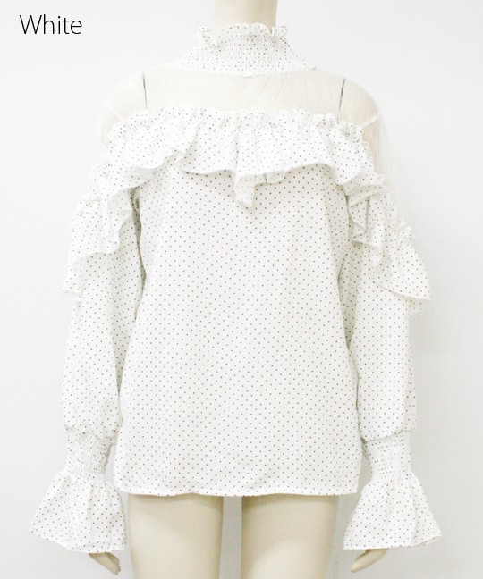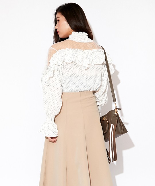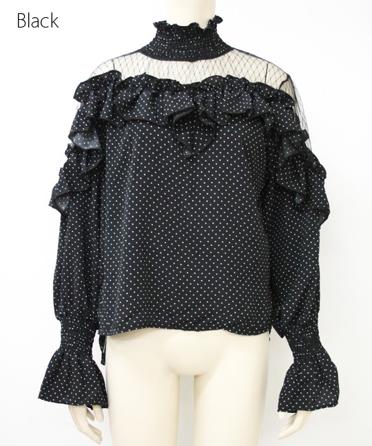 春のトレンド、ドット柄を使用したブラウスです。肩から二の腕にかけて透けているのでハイネックやフリルでも重たく見せず、バランス良いコーデにしあげてくれます。また、フロントのフリルが目を引くので腕や体を華奢に見せてくれる効果も期待できます。1枚で印象的なコーデに仕上げてくれるオシャレトップスですモデル 身長165cm Mサイズ