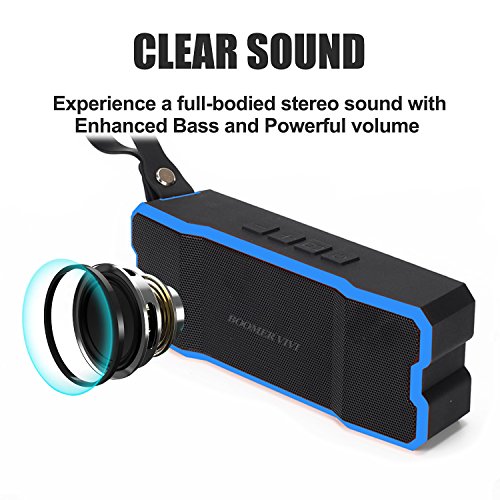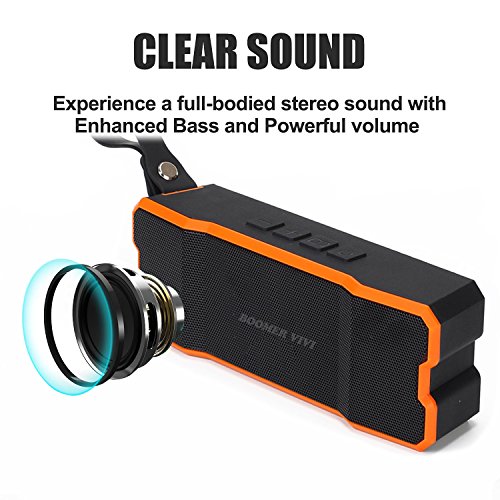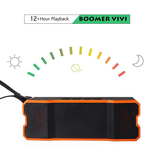-. Feature : WATERPROOF AND FLOATING:BOOMER VIVI B2 has designed and provided fully waterproof of highest incursion protection degree of IPX7.To be dust proof,mud proof,shockproof,rainproof,snowproof,free inflatable float accessory provided / 5W*2 POWERFUL SOUND,STEREO PAIRING FUNCTION:Advanced digital sound,noise/wind reduction technology,and unique loudspeaker cavity structure to deliver premium acoustic sound,crystal clear balanced bass,perfect for home,parties,school,Christmas gift,Thanksgiving day,Halloween,Black Friday / DURABLE,RED TOUGH DESIGN:Featuring a smooth rubber exterior that protects the speaker from scratches and impact,BOOMER VIVI B2 is one of the toughest Bluetooth speakers, perfect for travel&hiking, camping, Boating, Kayaking, outdoor adventure. / RECHARGABLE BATTERY,HANDS FREE FUNCTION:Built-in 4500mA Rechargeable Battery for up to 12 hours of playtime,enjoy the music from day to night freely.Answer phone calls using the hands free function. 3.5mm audio mini jack allows simple wired connectivity.NFC (near-field communication) technology enables simple one-touch pairing with select devices / WAHT YOU GET:BOOMER VIVI B2 Bluetooth speaker,Micro USB charing cable,Aux in cable,quick start guide,our worry-free 12-month warranty and friendly customer service,which make your purchase absolutely risk-free and you can enjoy testing out it's quality and durability!