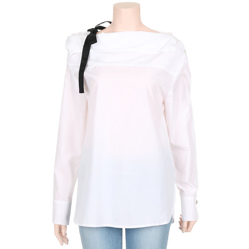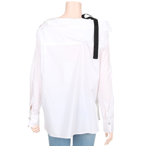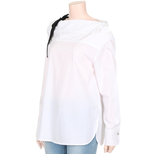한쪽 어깨에 리본 디테일로 여성스러운 느낌을 가미시킨 언밸런스 셔츠입니다.