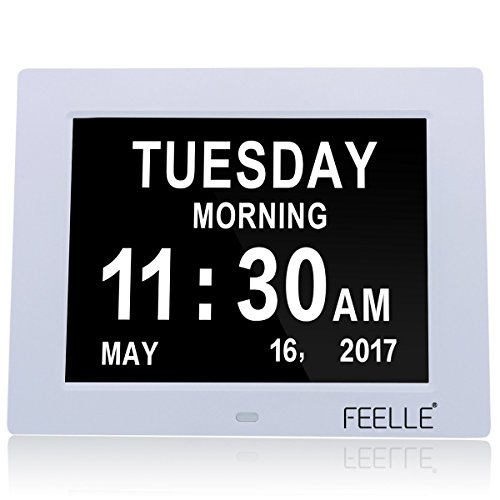 But the Feelle day clock has a clear and large screen with spelled out day/cycle of the day/date/time/month/year, which helps reduce anxiety about the time of day and ease the worry of missing an appointment, a favorite TV program, mealtime, or any other key event.