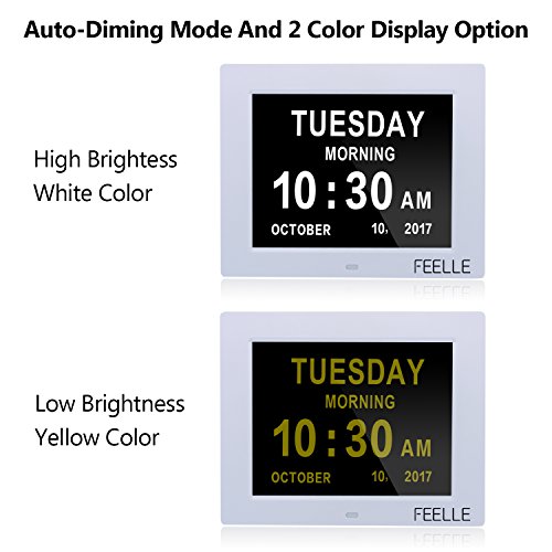 Feelle Memory Loss Day Clock Digital Calendar - Extra Large Non-Abbreviated Day & Month Digital Day Clock clearly spells out full day of week,month and date in large and bold letters non-abbreviated with high resolution ,memory loss vision impaired for Dementia Alzheimer's or the Elderly gift. Users which are very useful for senior people for daily meals or for taking medications.