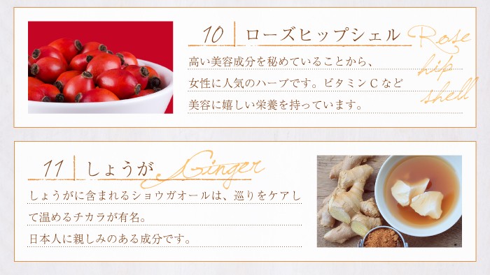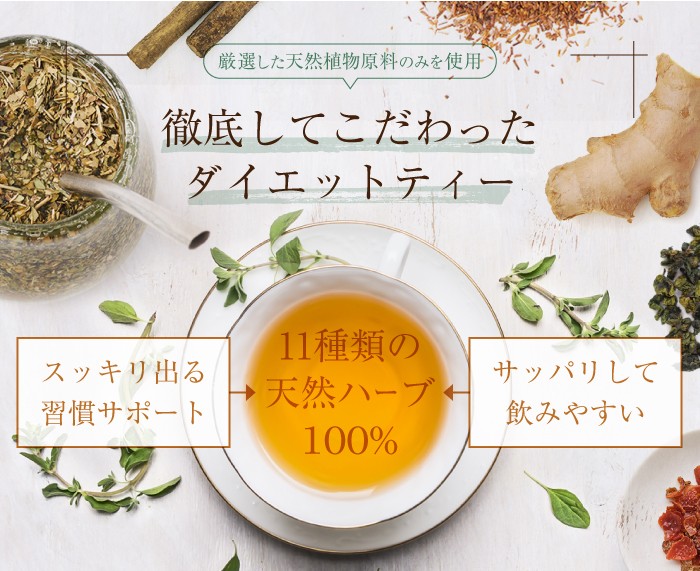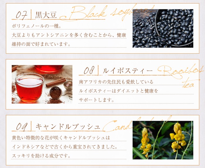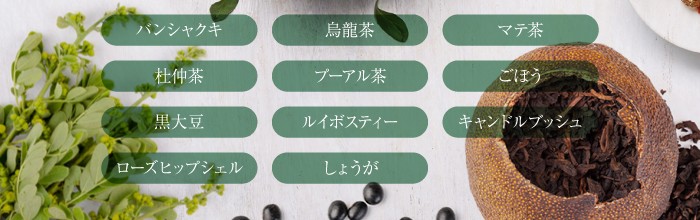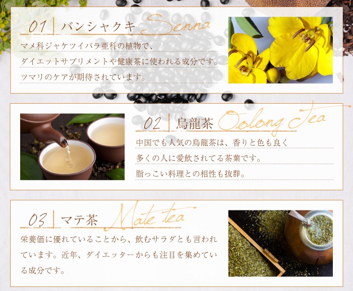 バンシャクキ(食用センナ茎)、烏龍茶、マテ茶、杜仲茶、プアール茶、ごぼう、黒大豆、ルイボスティー、キャンドルブッシュ、ローズヒップシェル、 しょうが (原料の一部に大豆を含む)