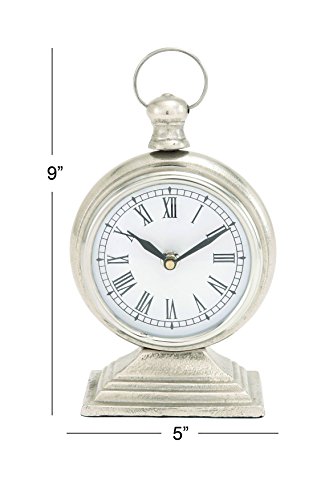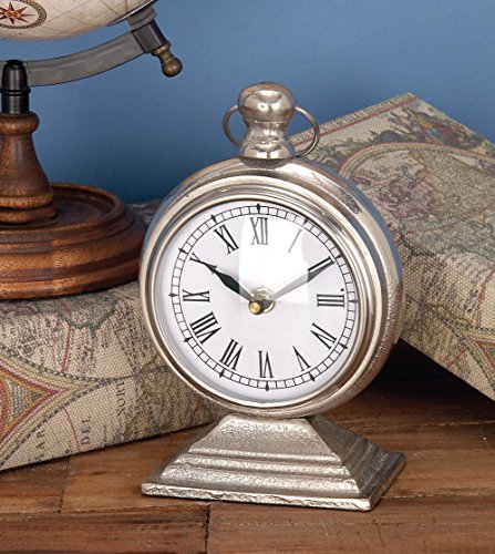 9 inch modern reflections rustic aluminum mantel clock, tarnished blemished silver-finish aluminum, round upright watch-style housing with tapered and beveled pedestal base, knob finial with loop handle, 1 AA battery-operated clock with glass crystal, black Roman numerals on white faceplate, black hour and minute hands. This product is manufactured in India.Feature