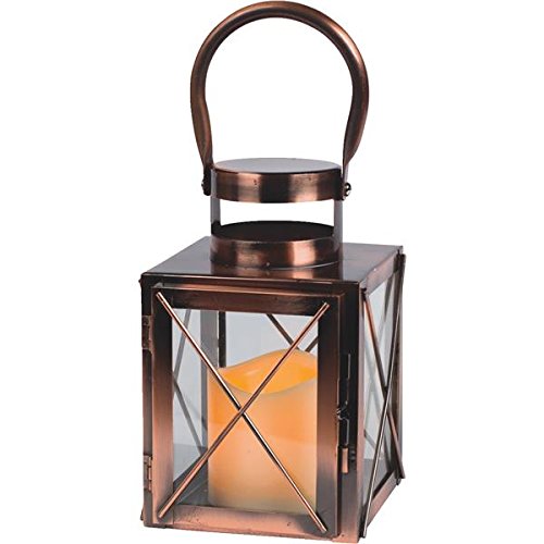 -. Feature : Beautiful 7.5-inch copper colored metal lantern with rigid glass panes is perfect for your deck or patio / Beautiful 7.5-inch decorative lantern / Metal in a copper color finish and rigid glass panes / Includes 3x3-inch indoor/outdoor LED candle with 5 hour timer feature, wavy edge design and soft glow flicker / Perfect for patios & decks