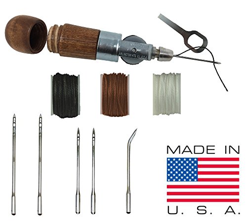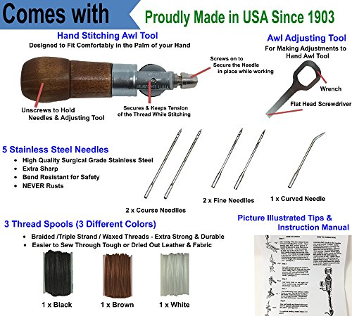 - INCLUDES: 1 Hand-Held Stitching AWL / 5 Interchangeable NEEDLES (2 Course, 2 Fine, 1 Curved) / 3 Replacement Spools of THREAD (1 Each of Black, White, and Brown) with picture Illustrated Tips & Instruction Manual
