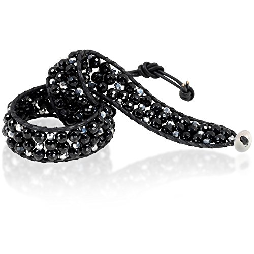 A genuine leather cord and beautiful onyx and crystal beads combine to make a fashionable and chic single-wrap choker or double-wrap bracelet