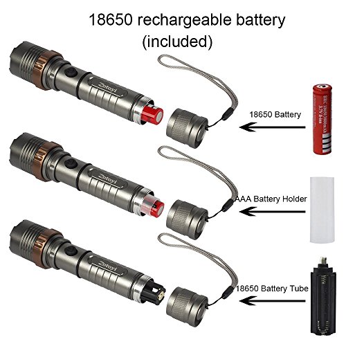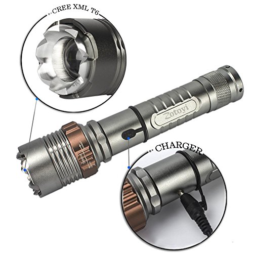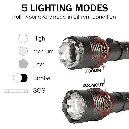 【Super Brightness & Zoomable LED Torch 】 High Power Flashlight 1000 Lumens XML-T6 LED Torch, Provides Ultra-bright Light and Strong Focus Spotlight over a Beam Distance of 200m. Adjustable Focus for use in Different Situations (just Rotate Torch Head to Adjust Zoom), Spotlight for long range observation and floodlight for large area illumination.