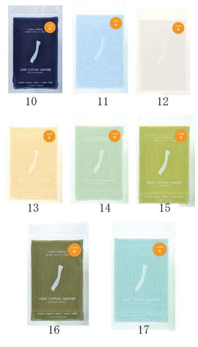 肌合いの良さの原点。ウォーキングにスポーツに、首に負担の掛からない重さに仕上げたマフラーです。 | |