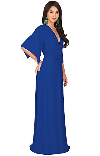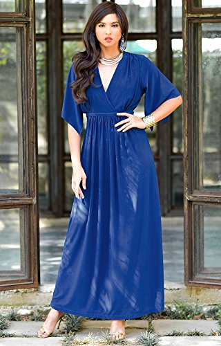 A stunning new caftan styled cocktail maxi dress with sleeves from Koh Koh that is the perfect evening dress. These beautiful designer caftan inspired maxi dresses are featured a v-neck front with half-short sleeves that cover just the top of the arm. The caftan styled cut provides for the perfect fitting as you simply tie the waist bands at the back of the dress to your perfect fit. Due to the position of the high waist-band, the dress has a generous empire waist and can be used as a maternity maxi dress, maternity dress, pregnancy dress or a lovely baby shower dress. These versatile maxi dresses are available in color Cobalt / Royal Blue and Plus Size Extra Large / XL / 14-16.