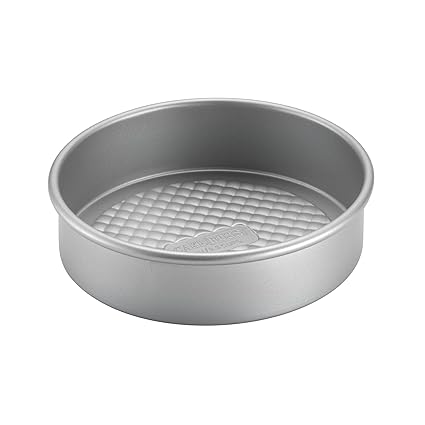 - The cake pan features durable, folded aluminized steel construction and wire-reinforced rolled rims to provide strength and stability
