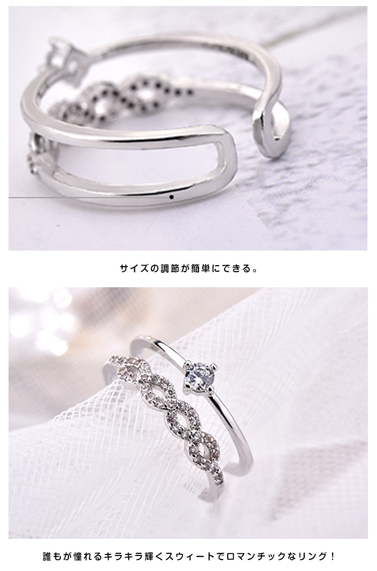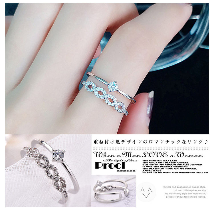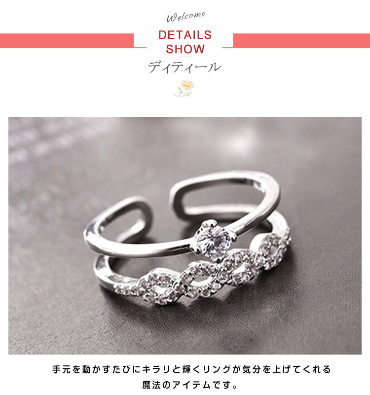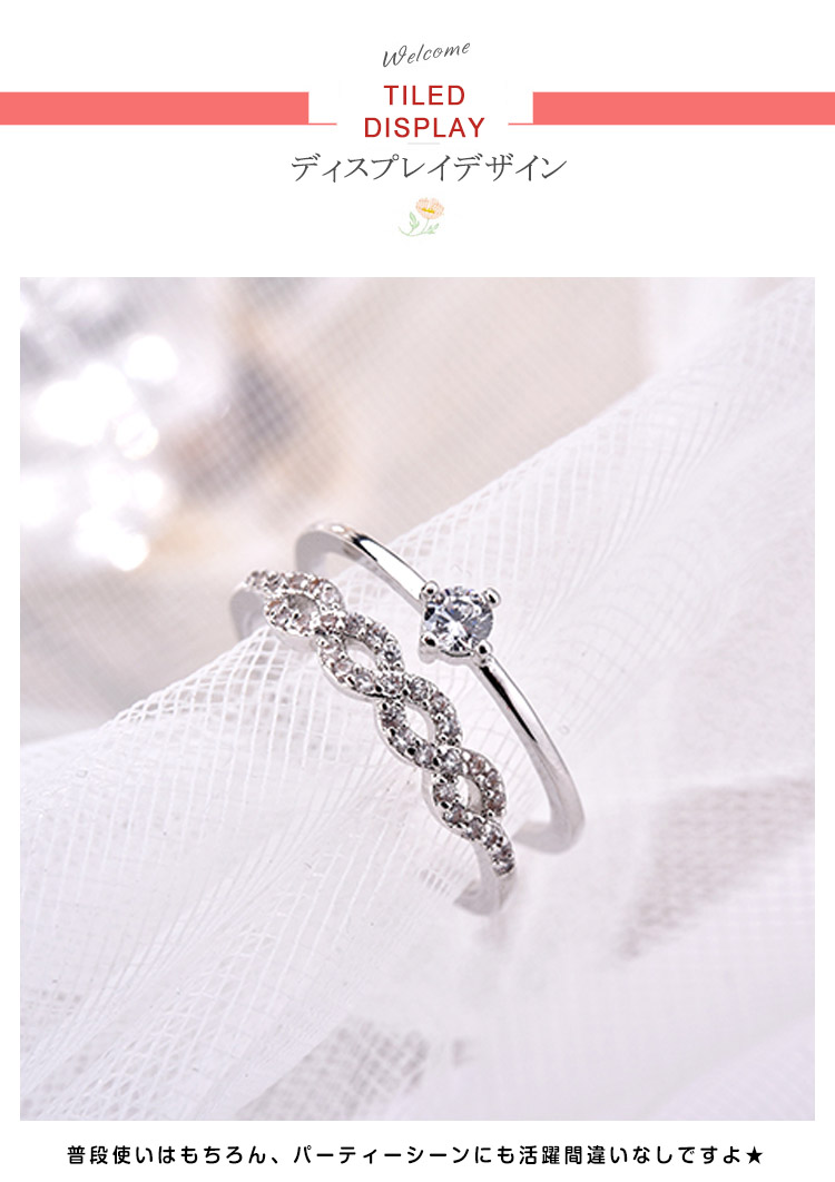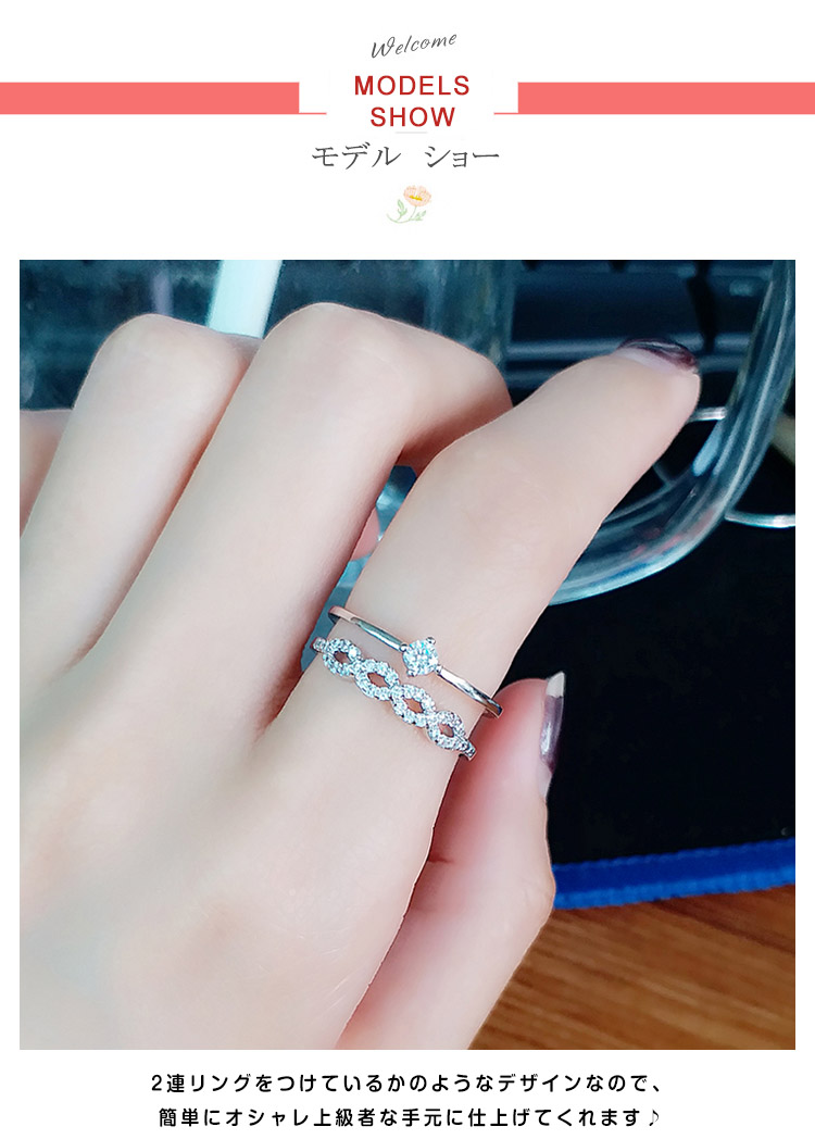 | 重ね付け風デザインのロマンチックなリング♪2連リングをつけているかのようなデザインなので、簡単にオシャレ上級者な手元に仕上げてくれます♪普段使いはもちろん、パーティーシーンにも活躍間違いなしですよ★ | |