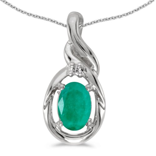 This 10k white gold oval emerald and diamond pendant features a 6x4 mm genuine natural emerald with a 0.31 ct total weight and shimmering diamond accents. 18" 14 Karat Gold Chain Included.