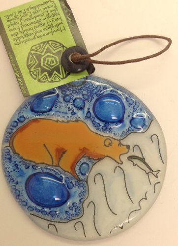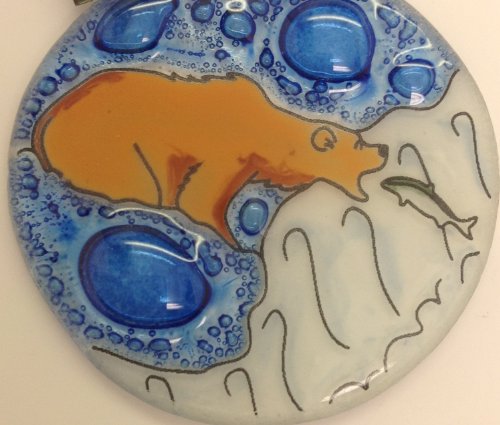 Nice Quality Fused Glass Ornament Sun Catcher 3" Brown Bear In River Salmon