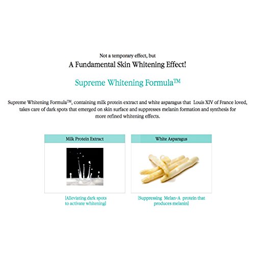 2. Supreme Whitening Formula : Supreme Whitening FormulaTM, containing milk protein extract and white asparagus that Louis XIV of France loved, takes care of dark spots that emerged on skin surface and suppresses melanin formation and synthesis for more refined whitening effects