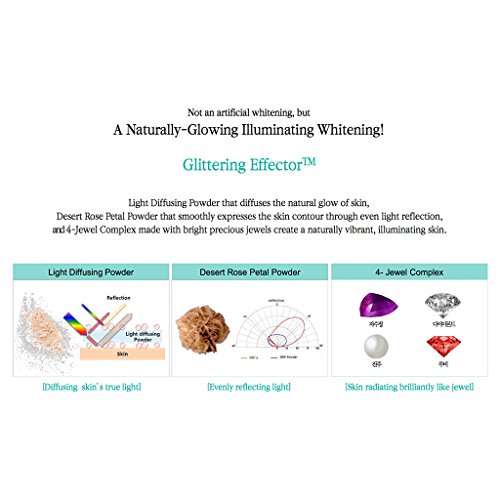 1. Glittering Effector : Light Diffusing Powder that diffuses the natural glow of skin, Desert Rose Petal Powder that smoothly expresses the skin contour through even light reflection, and 4-Jewel Complex made with bright precious jewels create a naturally vibrant, illuminating skin.