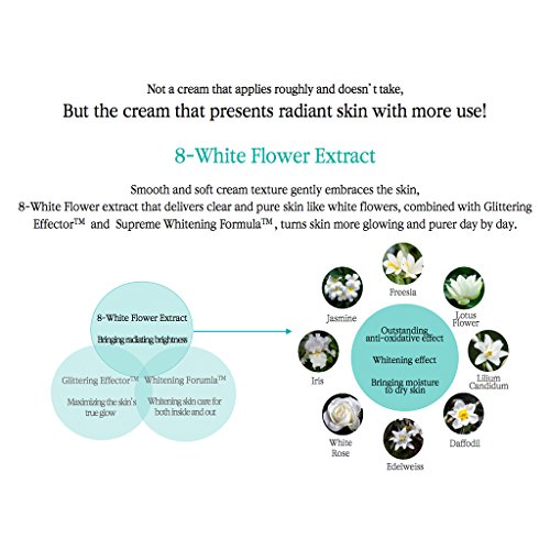 3. 8-White Flower Extract Smooth and soft cream texture gently embraces the skin, 8-White Flower extract that delivers clear and pure skin like white flowers, combined with Glittering EffectorTM and Supreme Whitening FormulaTM , turns skin more glowing and purer day by day.