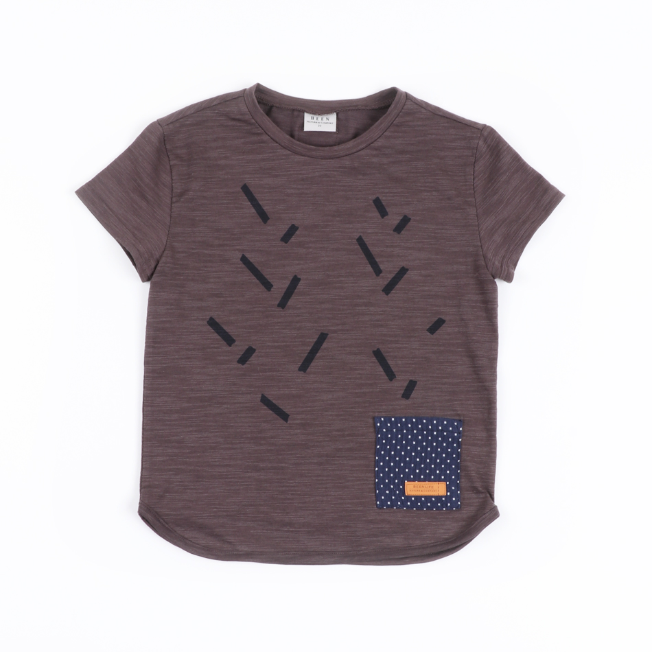 브라운 컬러의 남아 반팔 티셔츠 입니다.얇고 시원한 소재를 사용하여 브라운컬러로 시원하게 여름 타운 스타일링을 제안하는 아이템입니다.롤러로 찍어낸듯한 톤온톤 나염과 수공예느낌이 나는 배색이 포인트인 티셔츠 입니다.그레이팬츠와 함께 멋스러운 여름 타운 스타일링을 제안합니다.