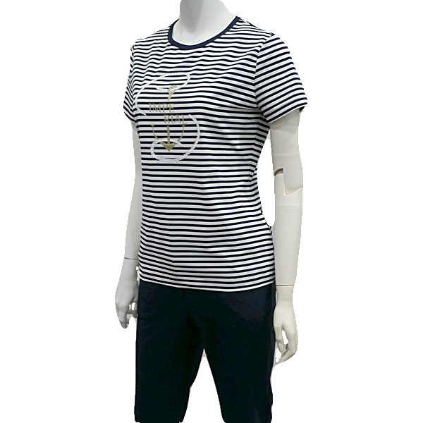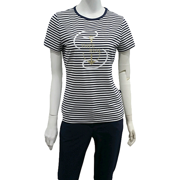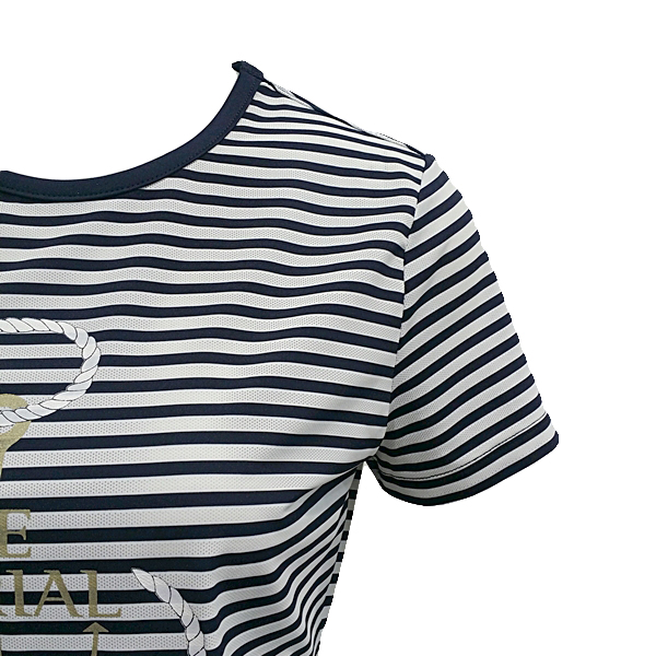변형 조직 스트라이프 소재에 배색으로 포인트를 준 라운드 티셔츠