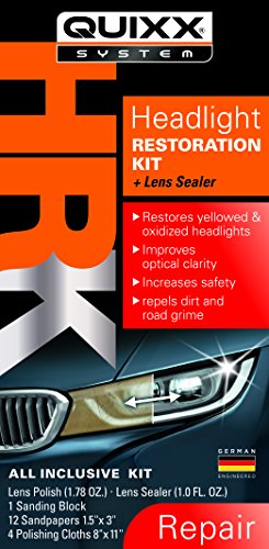 Quixx Headlight Restoration Kit restores yellowed and hazy headlights to their original crystal-clear and scratch-free finish. The complete all-in-one-box solution includes everything necessary to achieve professional results, allowing consumers to repair their vehicle’s plastic lens surfaces at a fraction of the cost of replacing them. Quixx Headlight Restoration Kit can restore up to 95% of a headlight’s original clarity and light performance, renewing a key safety feature of the vehicle.
