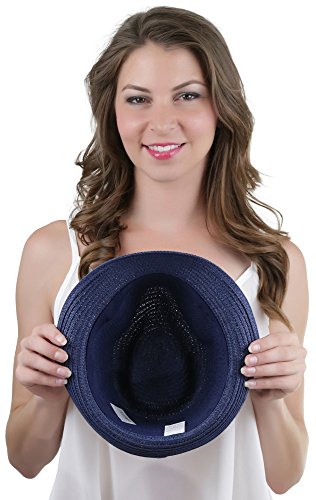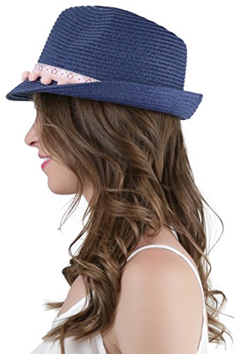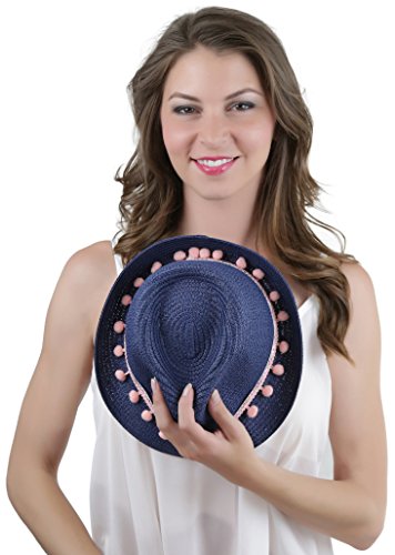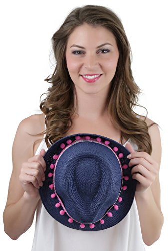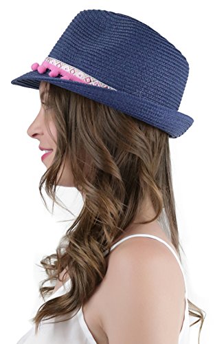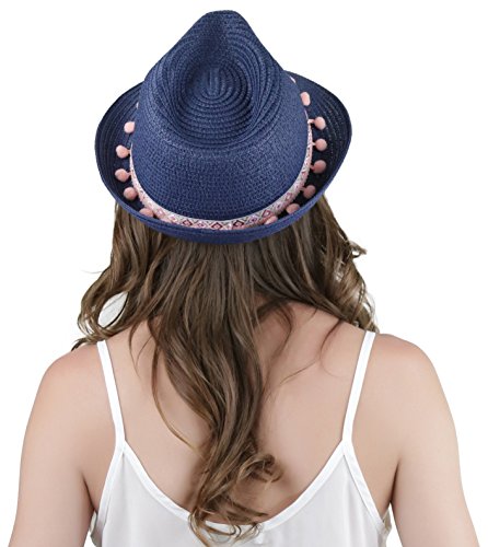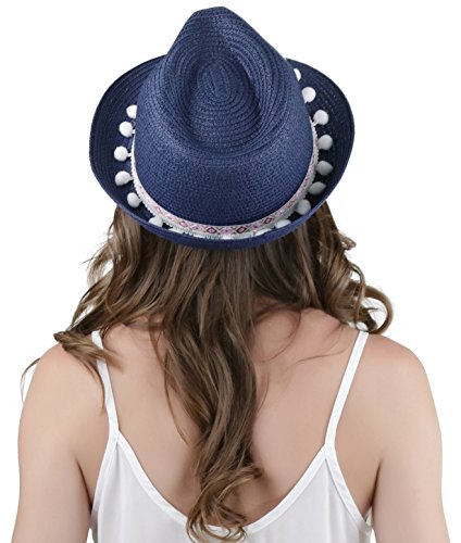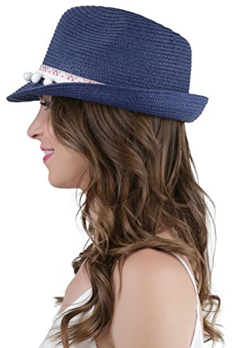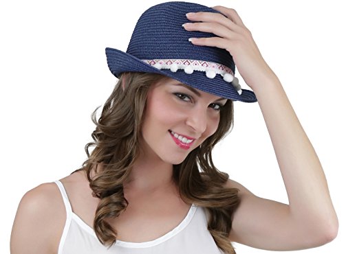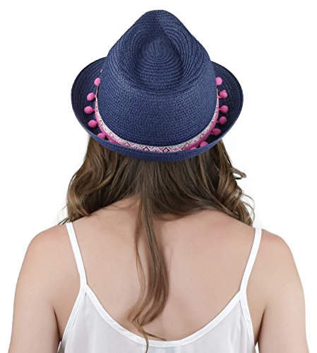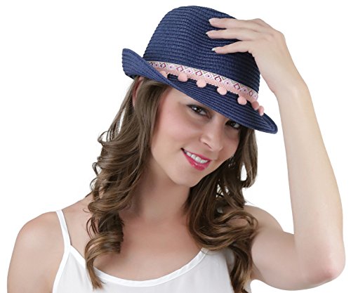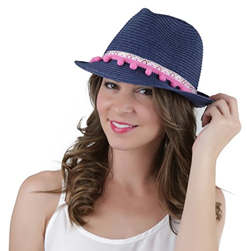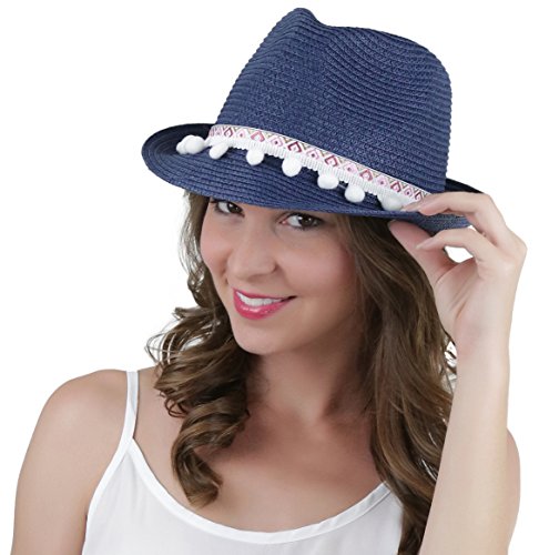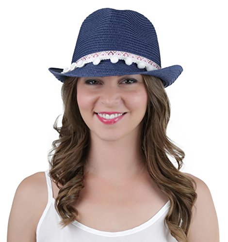 ToBeInStyle Women's Diamond Tribal Ribbon Cotton Ball Peaked Brim Navy Fedora