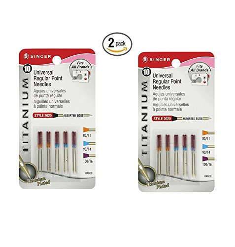 Singer Universal TITANIUM Regular Point Machine Needles 2 packages of 10 per pack Assorted sizes, 4 Size 80/11, 4 Size 90/14, and 2 Size 100/16