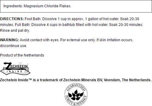 Refresh your body and mind with a soaking bath in our magnesium chloride flakes. It will leave your skin moisturized and soft. Use Swanson Magnesium Chloride Flakes in a full bath or a foot soak. After 30 minutes, you'll feel relaxed and refreshed. The magnesium chloride comes from the Zechstein seabed in the Netherlands, which is one of the world's purest sources.Feature
