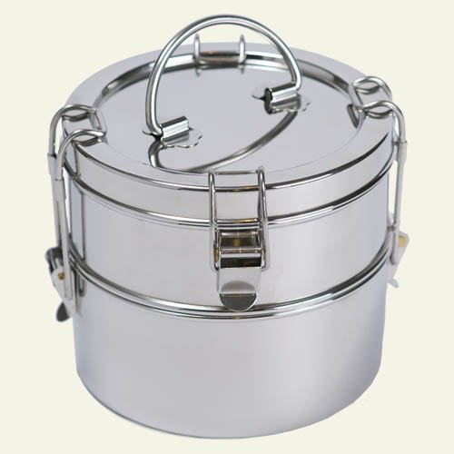 The To-Go Ware stainless steel 2-tier tiffin (a lunch box system that hails from India) is reusable, lightweight, and good for your health and the health of the planet. Perfect for work, school, picnics, concerts, travel and camping. It even makes a stylish doggy bag for your leftovers. Simple yet sturdy latching system allows you to carry just one container or all three. Fold down the handle to make it compact and easy to store and stack. Great for hot and cold food, the three containers keep courses separate. The 2-tier style offers maximum versatility, with space for small portions of salads, soups, fruit and yogurt, whatever you like. The new self-latching top container lets you use your tiffin solo for snacks or smaller meals, or as a dynamic duo! Just use soap and water, or pop it in the dishwasher to clean.