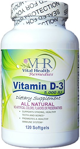 -. Feature : ALL NATURAL VITAMIN D-3 WITH 5,000 IU PER SOFTGEL: Vital Health Remedies' supplements are developed for maximum absorption of the ingredients and highest benefit to your body, using all natural ingredients with no artificial fillers or preservatives. / VITAMIN D is important for calcium and phosphorus absorption, the maintenance of healthy teeth and bones, a healthy immune system, brain and nervous system.* / NO ARTIFICIAL COLORS, FLAVORS, PRESERVATIVES, ADDITIVES OR FILLERS / SUPPORTS STRONG, HEALTHY TEETH AND BONES* / PROMOTES A HEALTHY IMMUNE SYSTEM*